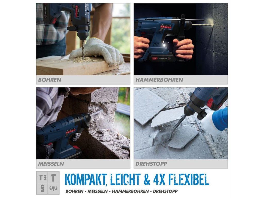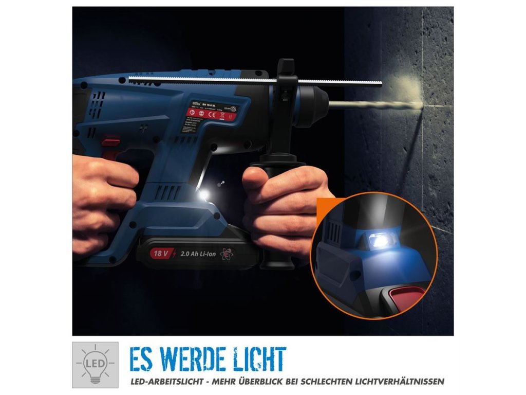 Pravý/levý chod, možnost vypnutí vrtání s příklepem, zastavení otáčení pro lehké sekací práce, LED pracovní světlo.