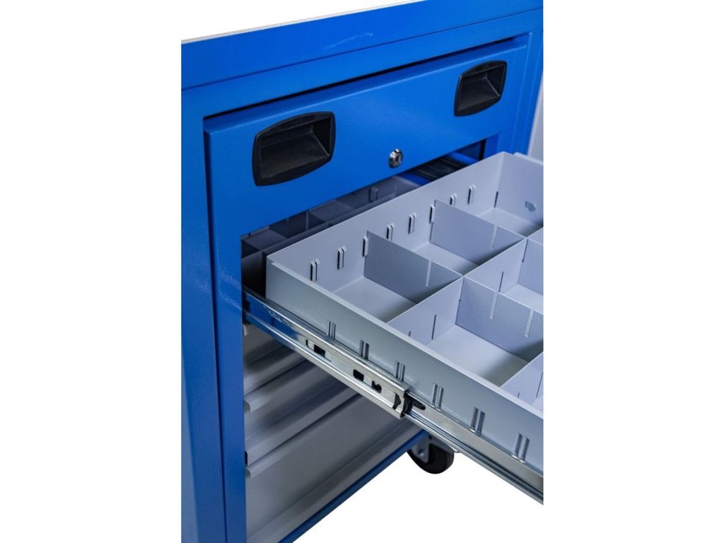 Pojízdný dílenský kontejner MULTI se 4 zásuvkami (-> 3 vrchní menší s podélnými/příčnými přihrádkami, spodní zásuvka bez dělicích příček), centrálním uzamykáním cylindrickým zámkem (-> 2 klíče), 4 celogumovými kolečky (-> průměr: 100 mm, 2 pevná/2 vodicí s brzdou) a 2 čelními transportními úchopy.