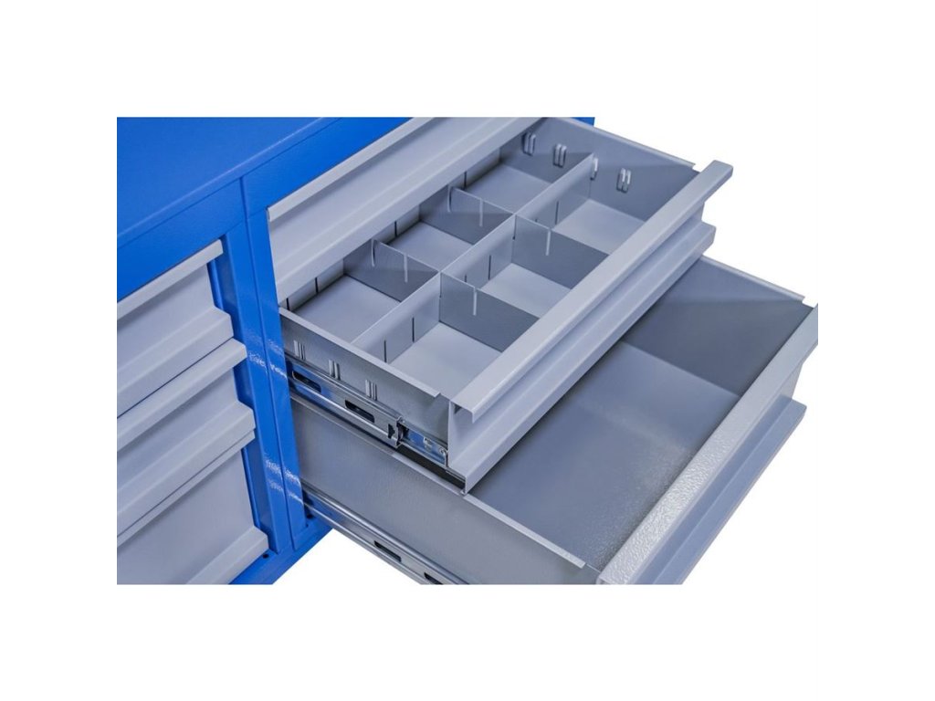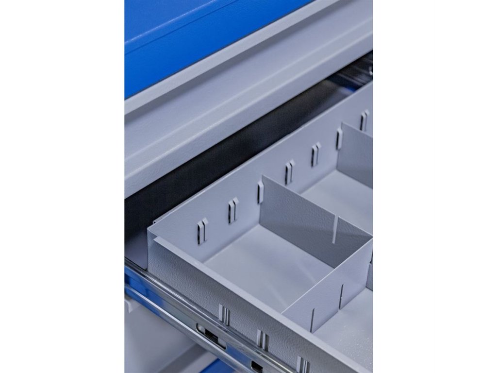 Vybavení: 2 zásuvkové díly se 3 zásuvkami (2/2 vrchní menší zásuvky, rozměry š x h x v: 430 x 520 x 85 mm, včetně univerzálně nastavitelných přihrádek: 3 podélné/3 příčné dělicí příčky); spodní velké zásuvky (-> 1/1, rozměry š x h x v: 430 x 520 x 165 mm).