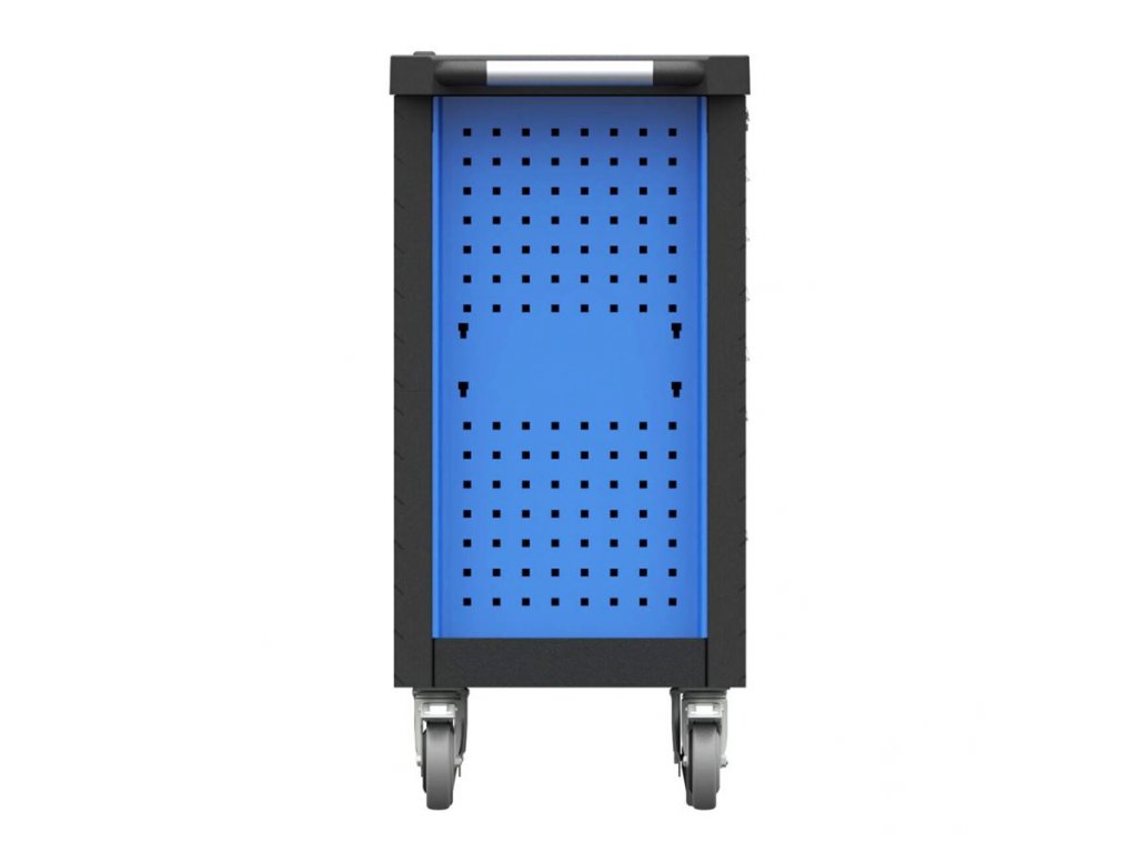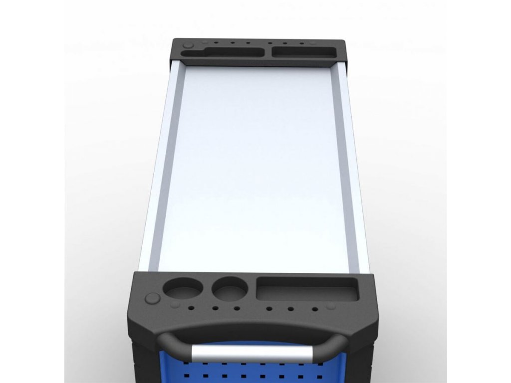Vrchní (nerezová) odkládací plocha se zvýšenými okraji (přihrádkami) • děrované boční stěny pro upevnění závěsných držáků (Q-systém; otvory 1 cm2) • svislé hrany vozíku vč. ochranných lišt proti náhodnému poškození např. karoserie servisovaného vozidla • transportní rukojeť • celogumová pojezdová kola (průměr: 150 mm, dvě vodicí s brzdou).