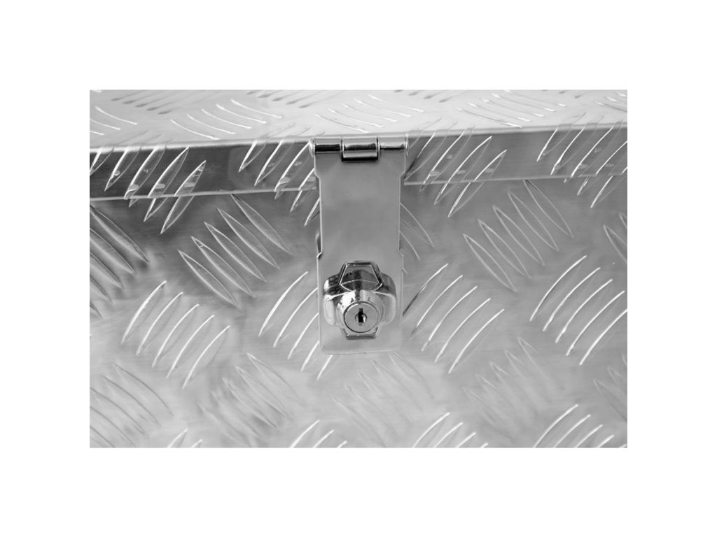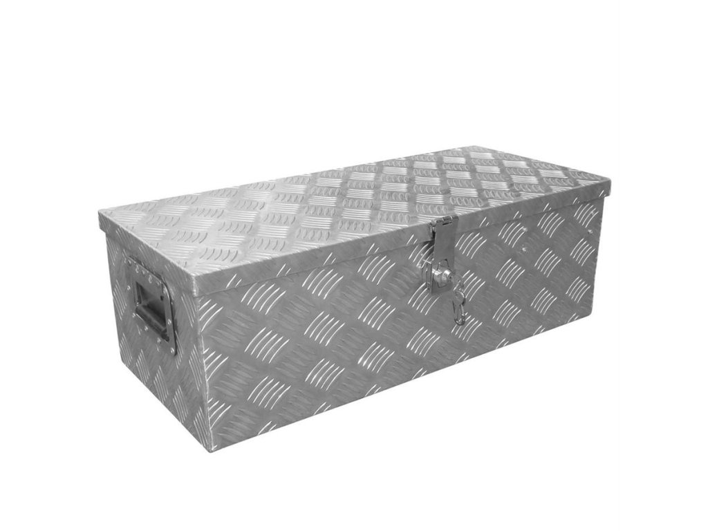 | Univerzální celokovový box z hliníkového šachovnicového plechu (trhací deska) pro bezpečné uložení a přepravu nářadí, vybavení nebo podobných předmětů. - Vysoce kvalitní uzamykací mechanismus s klíčem - Pohodlná přeprava díky pogumovaným rukojetím s napínací pružinou - Ideální do dílny, sklepa, přívěsu, pickupu a na plošinu |