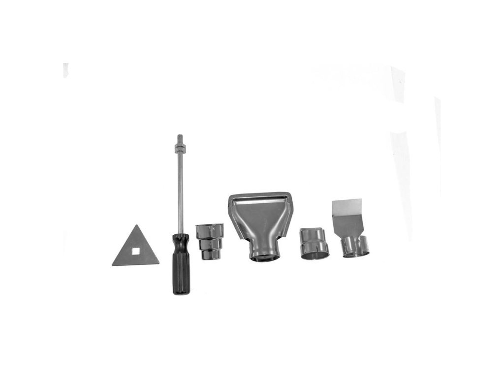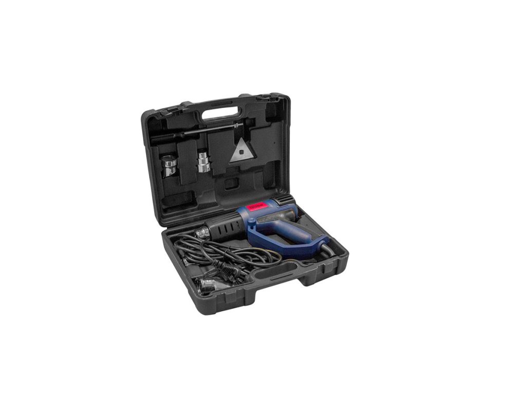 Příslušenství: sada trysek (-> 4, plochá/nahřívací/redukovaná/reflektorová), ocelová škrabka pro odstraňování barev/tmelu, plastový transportní kufřík.