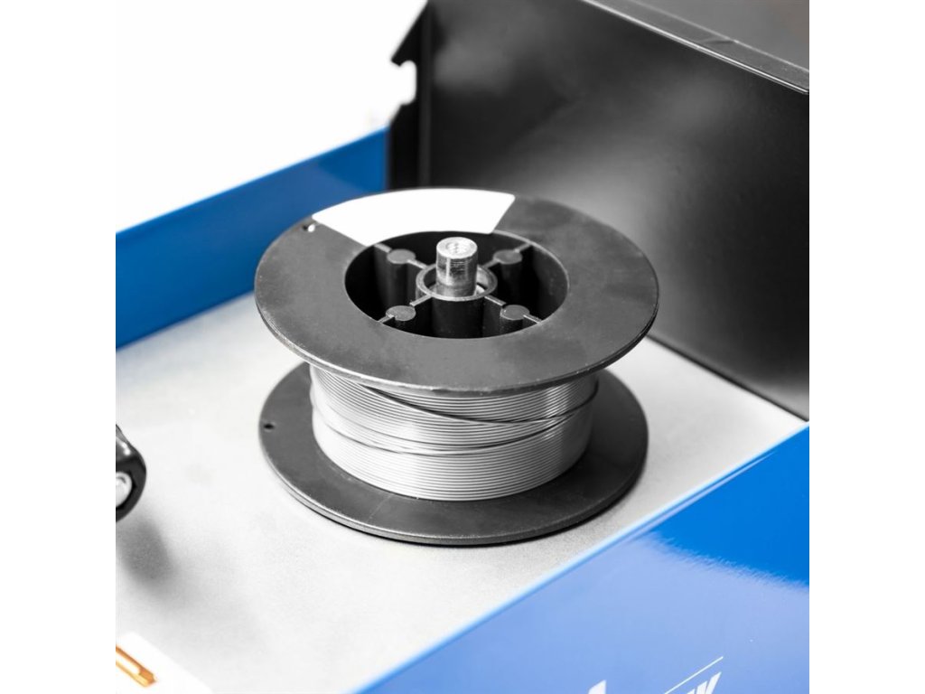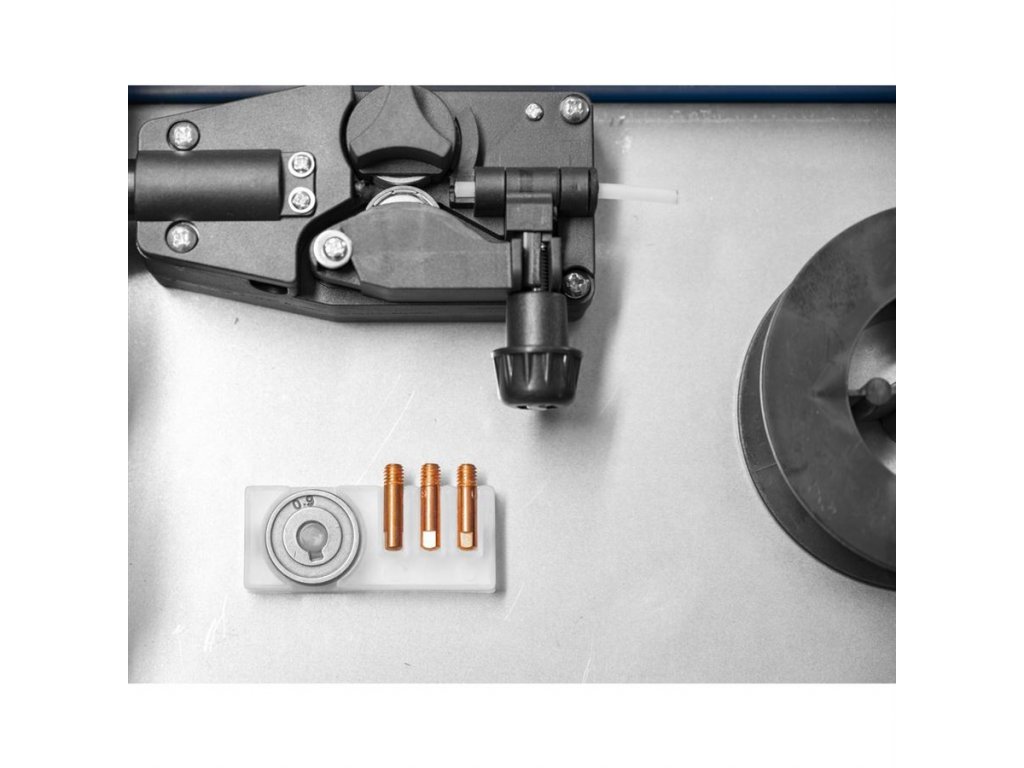 Výrobek obsahuje: svářecí kabel, zemnící kabel, drátěný kartáč s kladívkem, štít, náhradní kladku, 3 proudové trysky 0,9 mm, plněný drát (0,9 mm / 0,45 kg).