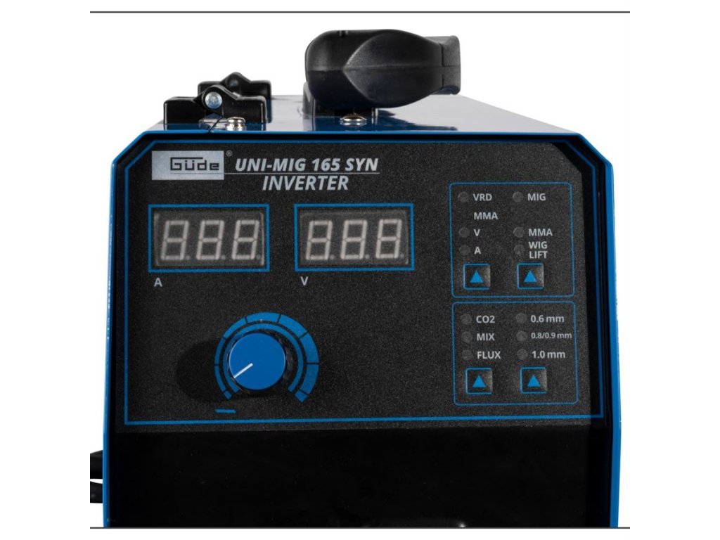 Multifunkční invertorová svářečka Güde, určená pro obloukové svařování metodami MMA, FCAW, MIG/MAG a WIG.