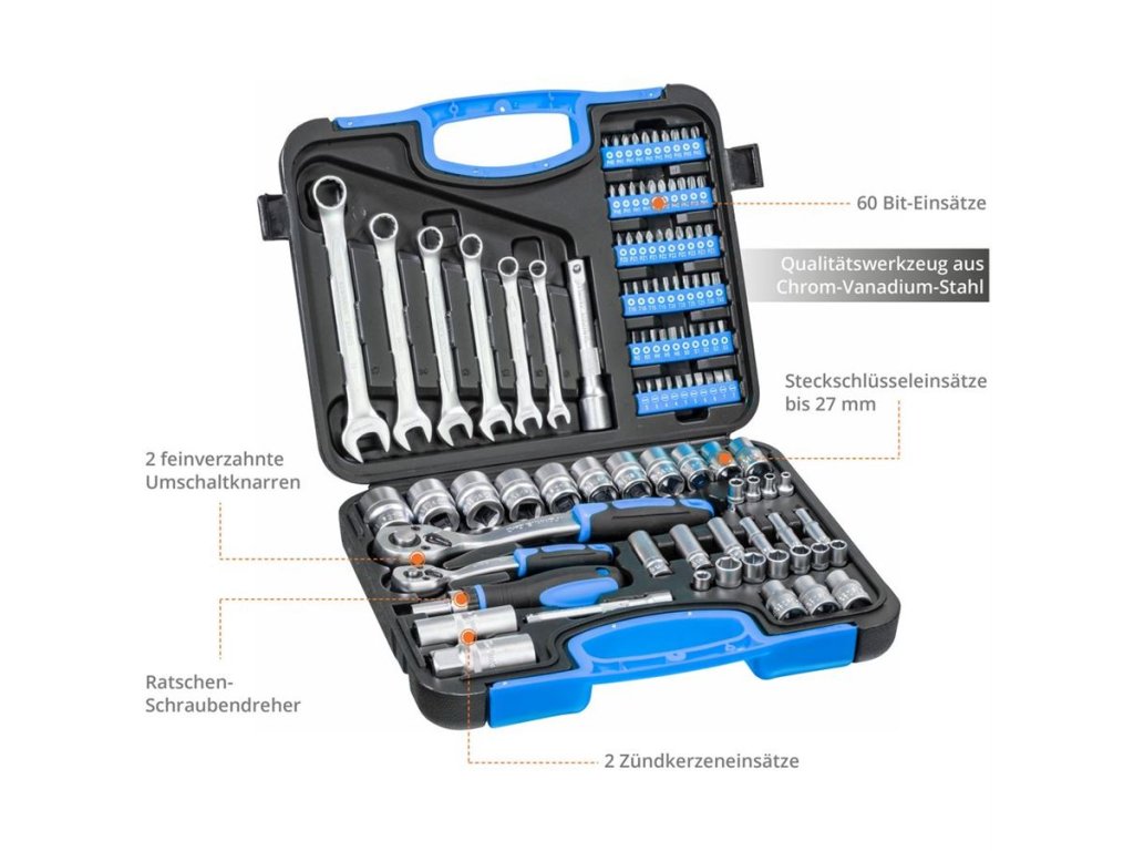 Tato sada nářadí v praktickém kufříku se skládá ze 104 dílů. Obsahuje 2 ráčny (1/2" a 1/4" se 72 zuby) s vhodnými krátkými a dlouhými hlavicemi a odpovídajícími prodlouženími. Tuto sadu doplňuje velký sortiment bitů, nástrčných hlavic, šroubovák s ráčnovou funkcí, stejně jako všechny potřebné adaptéry a 6 očkoplochých klíčů.