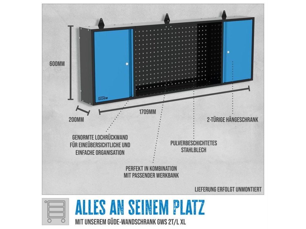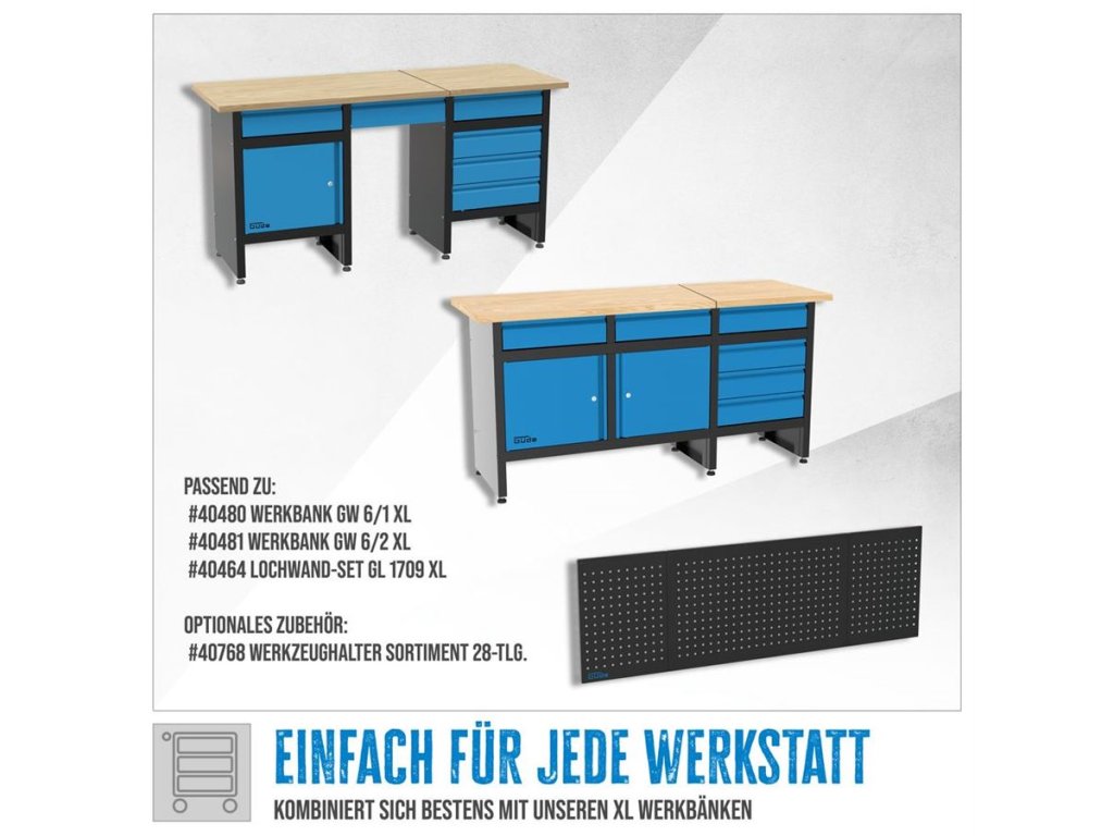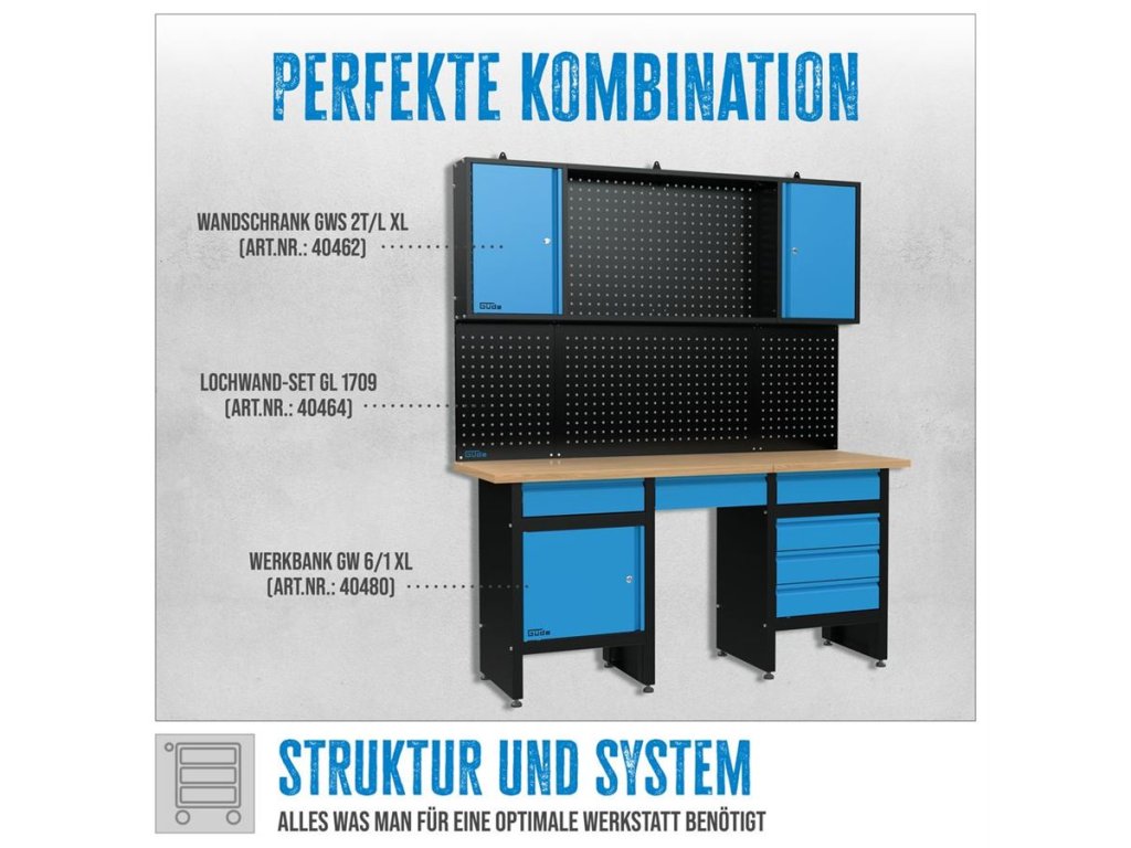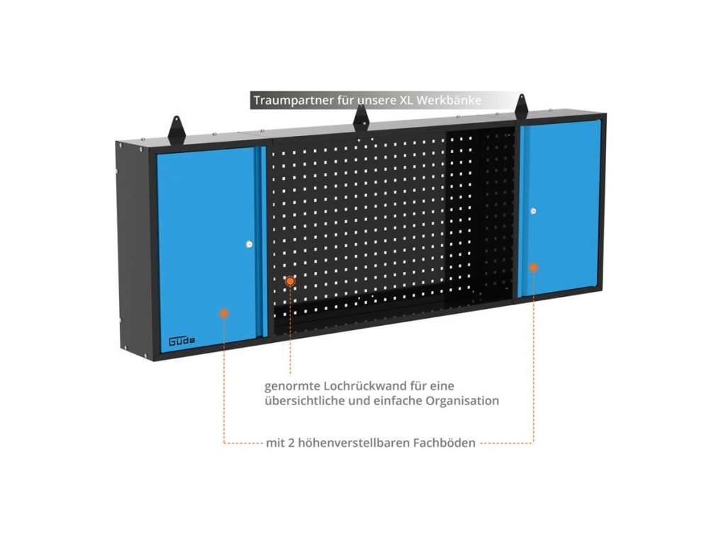 | Tato dvoudveřová nástěnná skříňka s praktickým integrovaným perforovaným panelem je dokonalým doplňkem řady Güde Eco Line, která nyní umožňuje optimálně využít prostor na stěně nad našimi dvěma pracovními stoly XL. - 2 výškově nastavitelné police - Ideální v kombinaci s odpovídajícím pracovním stolem - Standardizovaná perforace: čtvercová, 9 x 9 mm, rozteč otvorů 38 mm - Práškově lakovaný ocelový plech - Dodává se v nesmontovaném stavu Vhodné pro: - 40480 Pracovní stůl GW 6/1 XL - 40481 Pracovní stůl GW 6/2 XL - 40464 Sada perforovaných panelů GL 1709 XL Volitelné příslušenství: - 40768 Sada držáků nástrojů 28 ks. Všechny držáky nástrojů a háčky jsou vhodné pro perforované stěny a systémy Güde se čtvercem otvorů 10 x 10 / 9 x 9 mm a osovou vzdáleností otvorů 38 mm. |