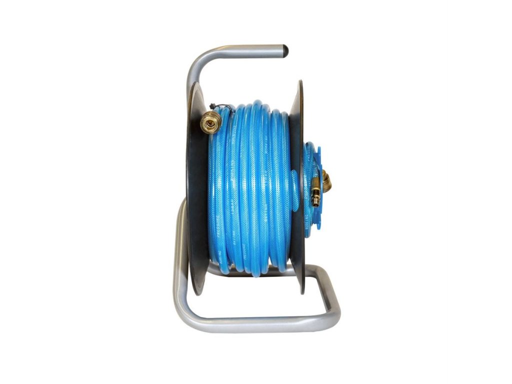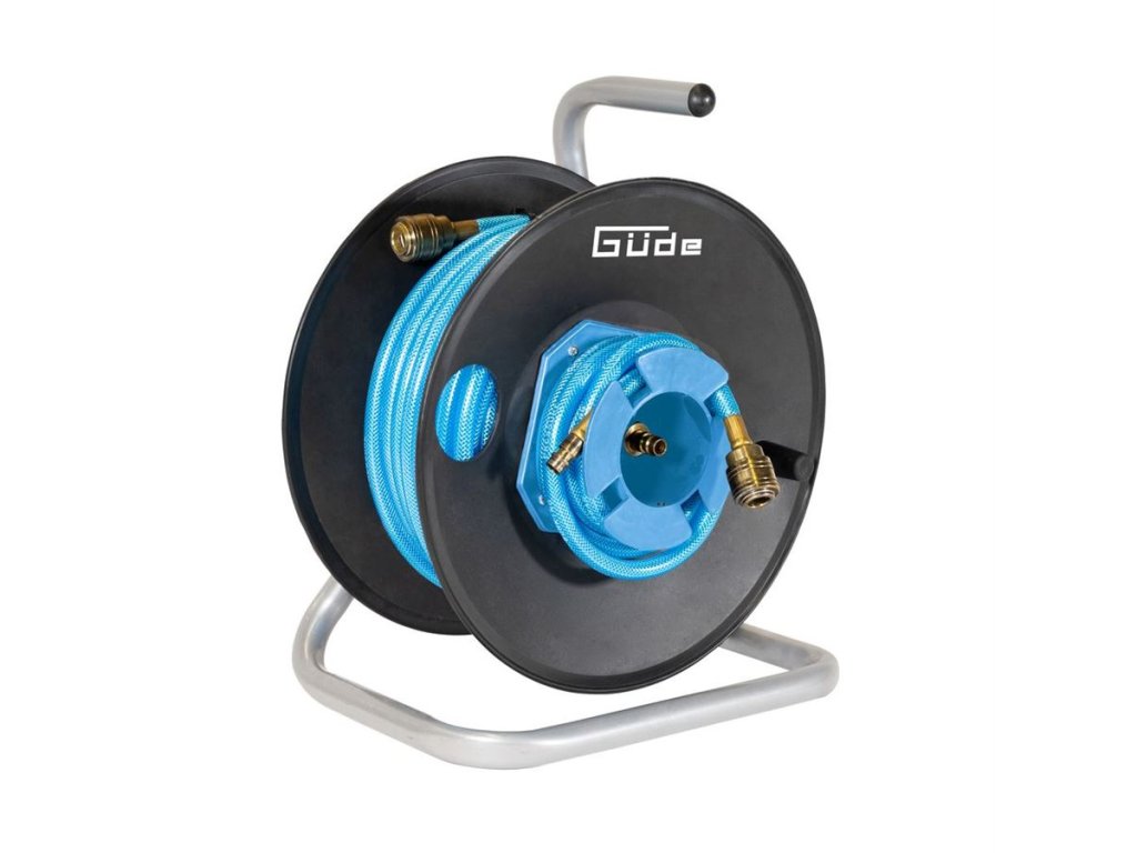 Přenosný hadicový naviják Güde, určený k zavedení stlačeného vzduchu i mimo prostor pracoviště nebo do vzdálenějších částí dílny.