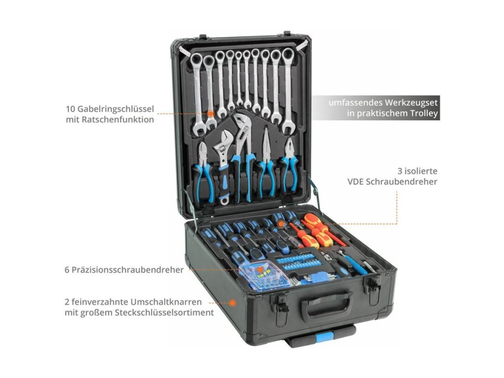Praktický, mobilní vozík na nářadí s působivou 500dílnou výbavou široké škály šroubováků, ráčnových a nástrčných klíčů, různých kleští a kombinovaných ráčnových klíčů až po bitový šroubovák s ráčnovou funkcí a odpovídající sortiment bitů.