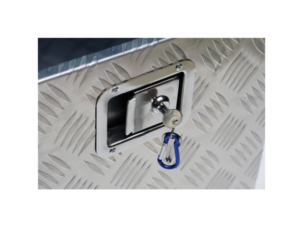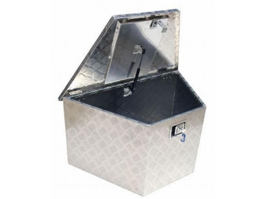 Robustní hliníková bedna, určená k montáži na oj přívěsu za účelem přepravy nářadí, strojů, pracovního materiálu apod.
