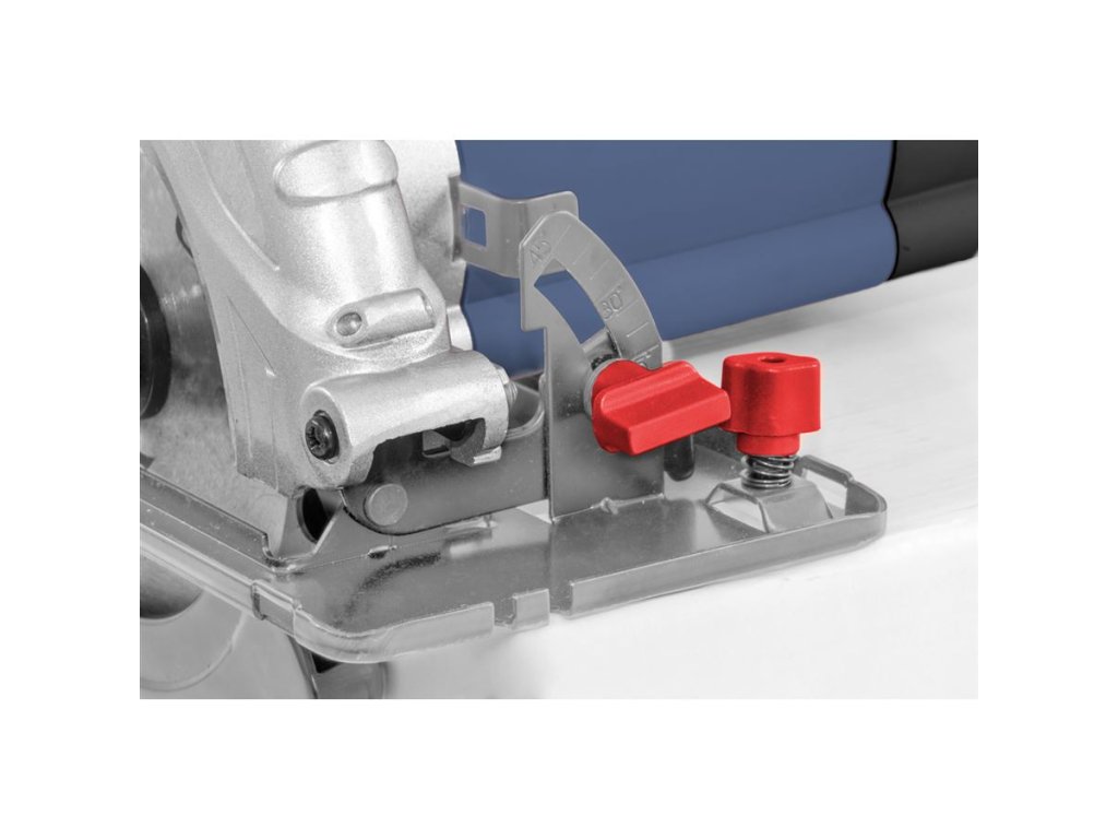 Přesné nastavení hloubky řezu (-> 0°: 0 - 55 mm/45°: 0 - 38 mm), vodicí deska s bočním naklápěním 0 - 45°, aretace hřídele pro snadnou/rychlou výměnu kotouče.