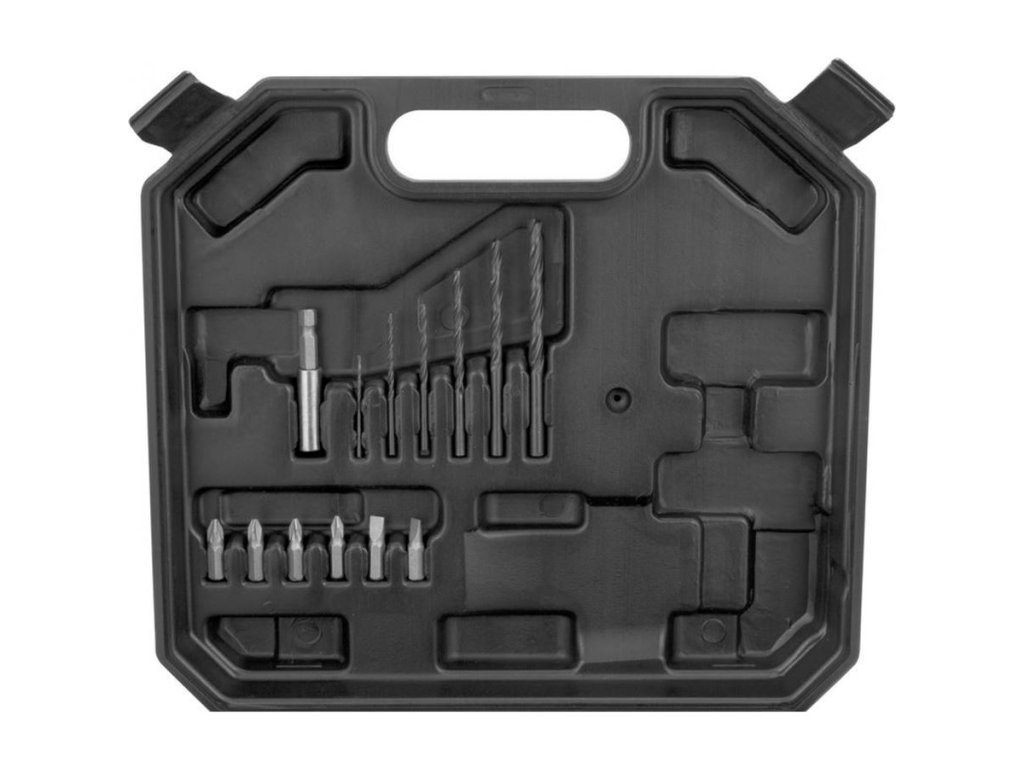 Vybavení: 2 Li-Ion akumulátory 12 V/2,0 Ah; nabíječka 2,0 A/h; sada vrtáků, 6dílná (HSS; pr. 1,5-2,5-3,0-4,0-5,0-6,0 mm); sada bitů, 6dílná (Cr-V; pr. 5-6 mm, PH1, PH2, PZ1, PZ2); plastový transportní kufřík.