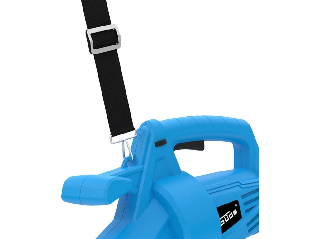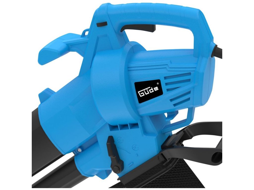 Elektrický vysavač GÜDE, určený k odstranění drobného rostlinného odpadu ze zahradních trávníků i zpevněných ploch okolo domu.
