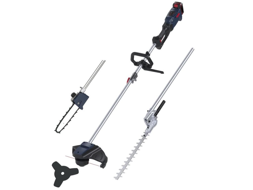 Multifunkční sada akumulátorové jednotky Güde a tří samostatných nástavců, určená ke komplexní péči o zahradu a zeleň.